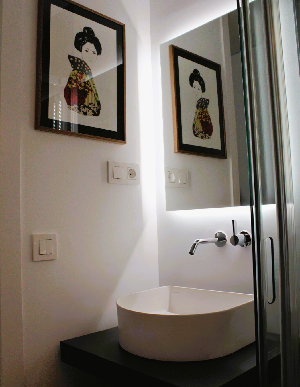 En el baño de invitados, el espacio se aprovecha al máximo mediante la combinación atemporal del lavabo Sonar con el minimalista caño mural Kartell • LAUFEN, el inodoro suspendido de la misma colección y los accesorios ILBAGNOALESSI, que completan un conjunto tan funcional como elegante junto a la práctica zona de ducha Kartell • LAUFEN.